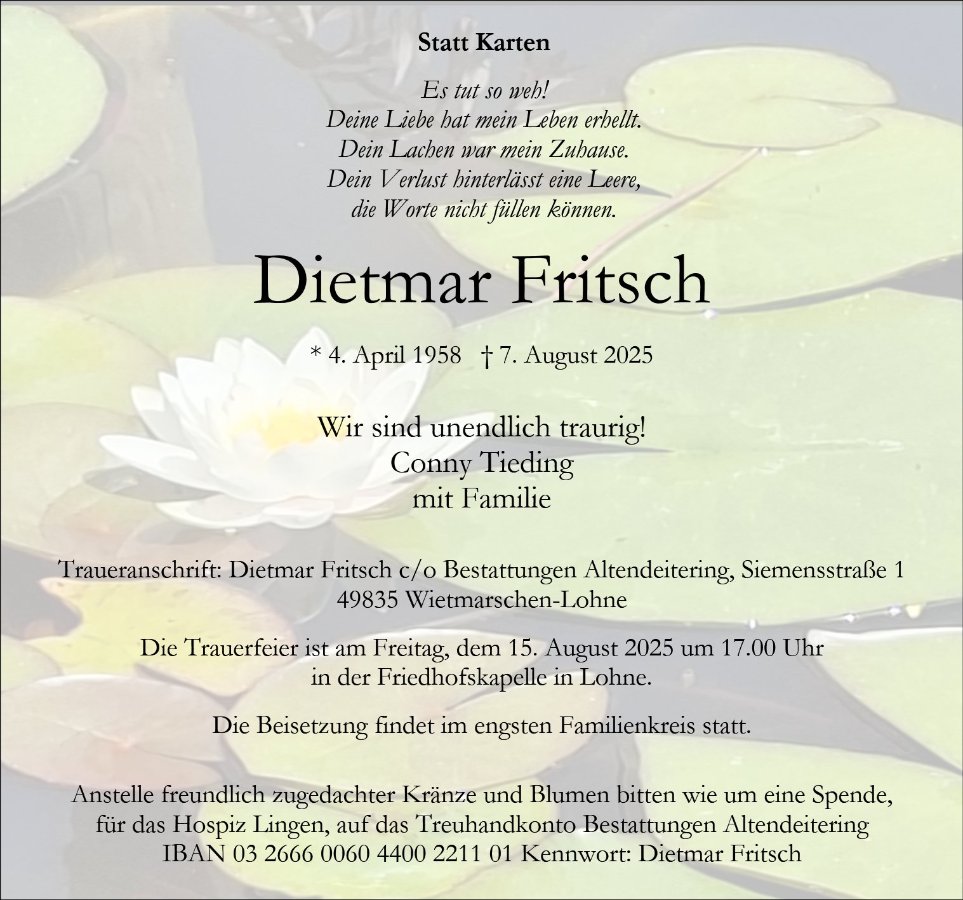 Ich wünsche der Familie von Dietmar viel Kraft. Auch wenn wir nur immer alle 6 Wochen einen Termin hatten werde ich seine Geschichten von dem was er alle schon erlebt hat sehr vermissen. Mach's gut und pass auf die hier unten gut auf.