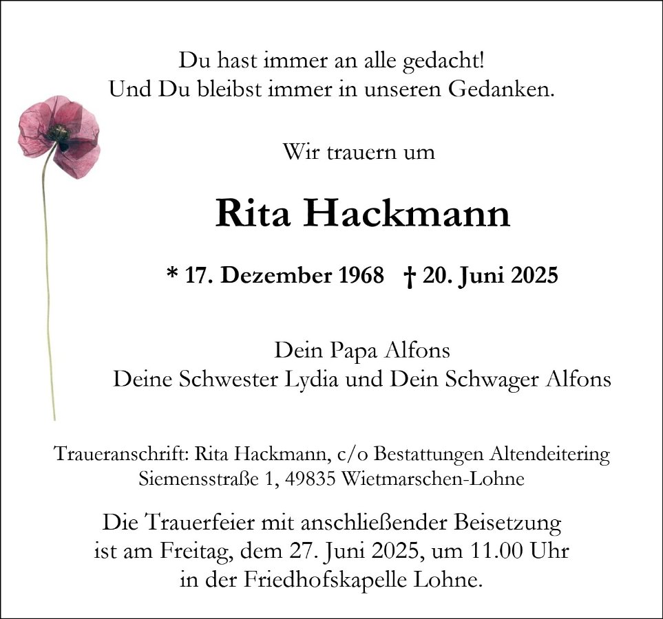Rita Hackmanngestorben am 20. Juni 2025